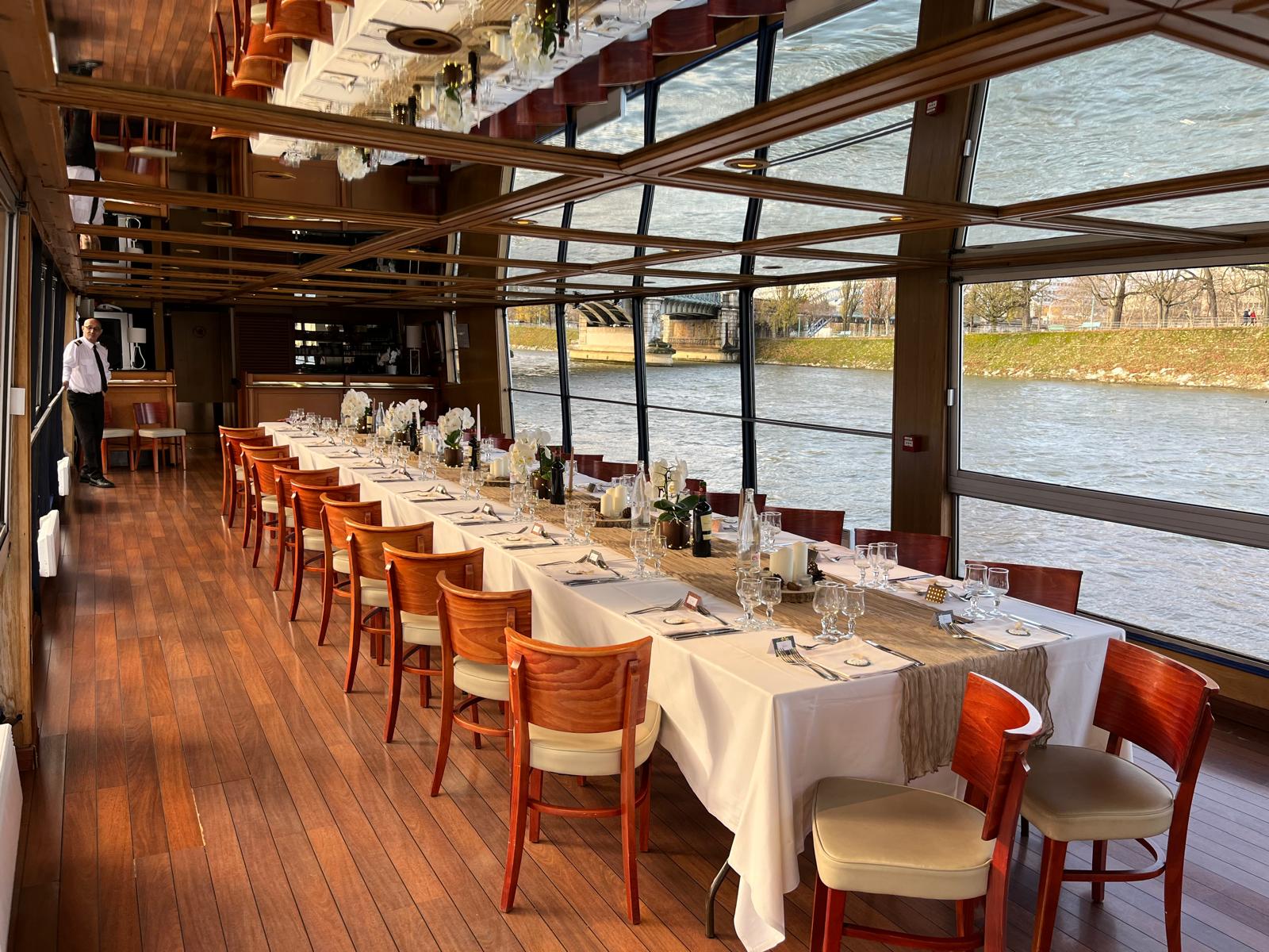 Le Rive Droite est un bateau navigant élégant amarré au Port de Billy ou à d’autres quais parisiens ou encore à Boulogne avec un parking privé et gratuit , offrant un cadre unique pour organiser des événements sur la Seine au cœur de Paris. Grâce à ses larges baies vitrées panoramiques et ses espaces chaleureux en bois, les invités profitent d’une vue exceptionnelle sur les quais et les monuments parisiens tout au long de la croisière.