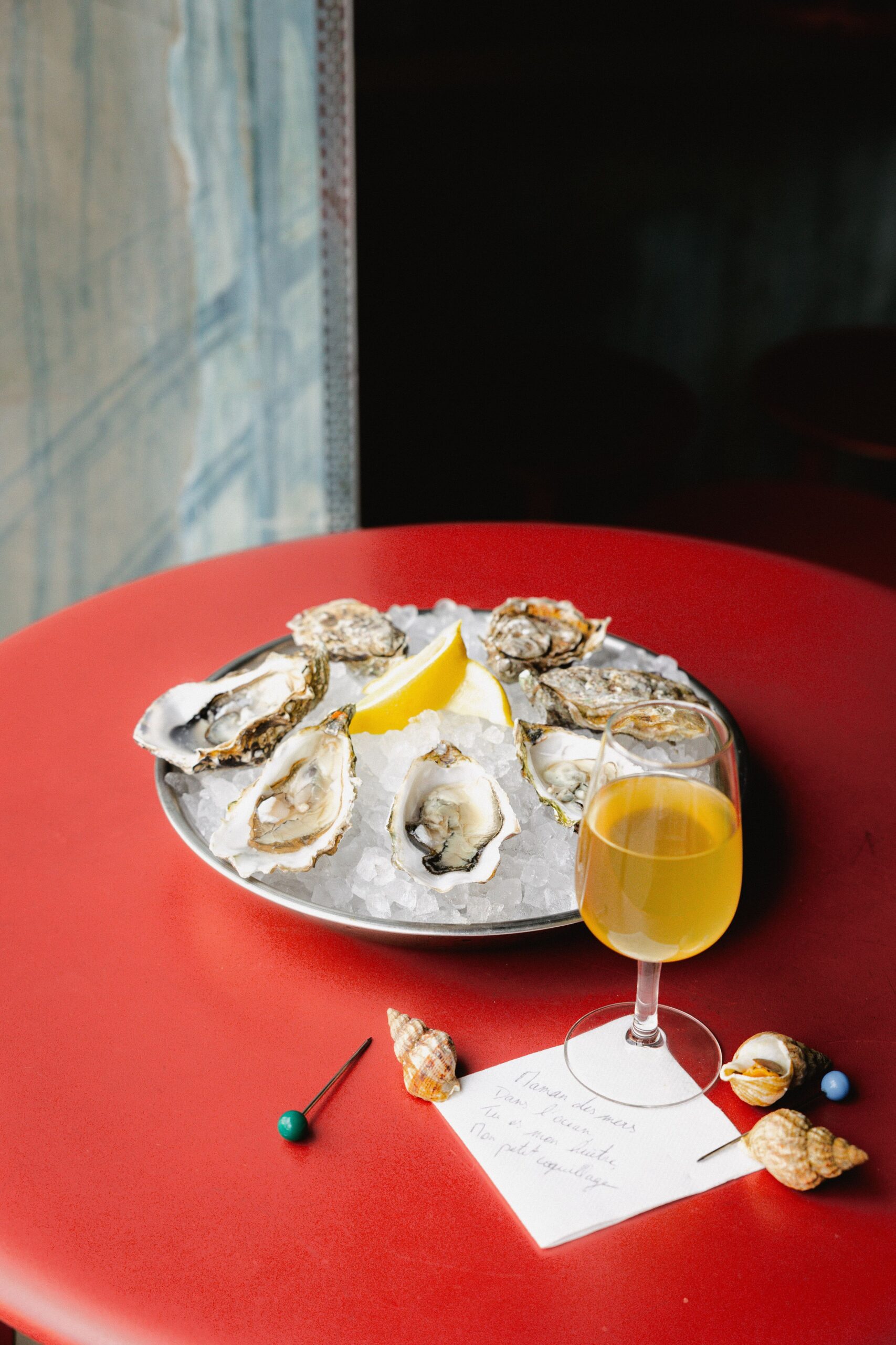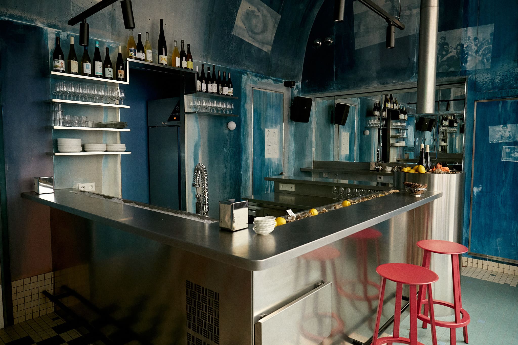 L’architecte Marion Mailaender a imaginé un lieu à la façade en acier brut qui rappelle les devantures des poissonneries de quartier, s’ouvrant par de larges baies vitrées sur la rue et la vie parisienne. Comme une halle de marché, avec son comptoir d’écailler, Citrons et Huitres invite à se retrouver avant ou après un concert à La Cigale ou une soirée au Mikado d’à côté.