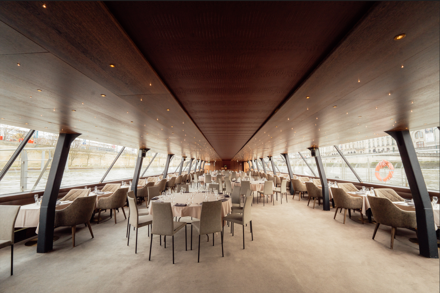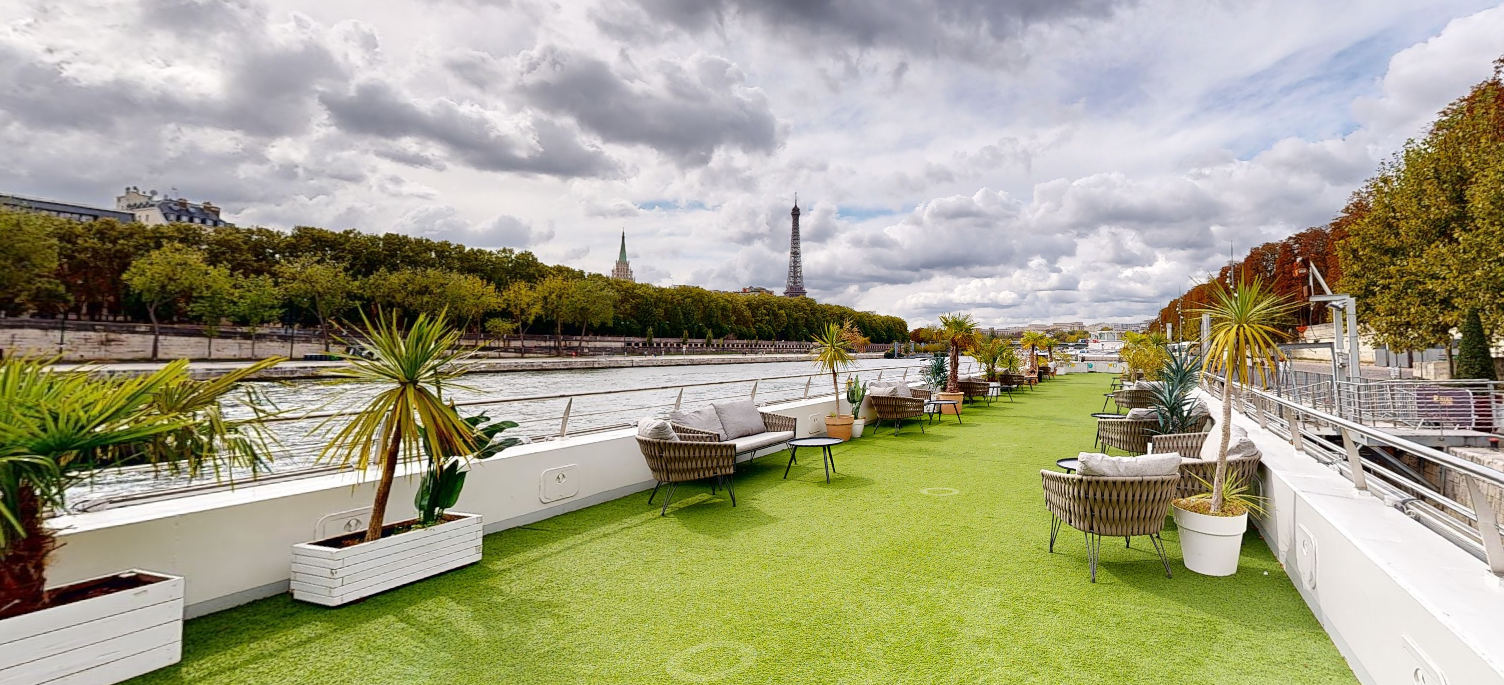 Le Zouave, son nom est une référence au Zouave du pont de l’Alma, célèbre statue devenue un indicateur de la hauteur du fleuve. Ce bateau propose le plus grand Rooftop de la flotte, pour profiter au mieux de la vue sur Paris. Son espace intérieur cosy avec ses quelques recoins permet de multiples combinaisons pour les événements.
