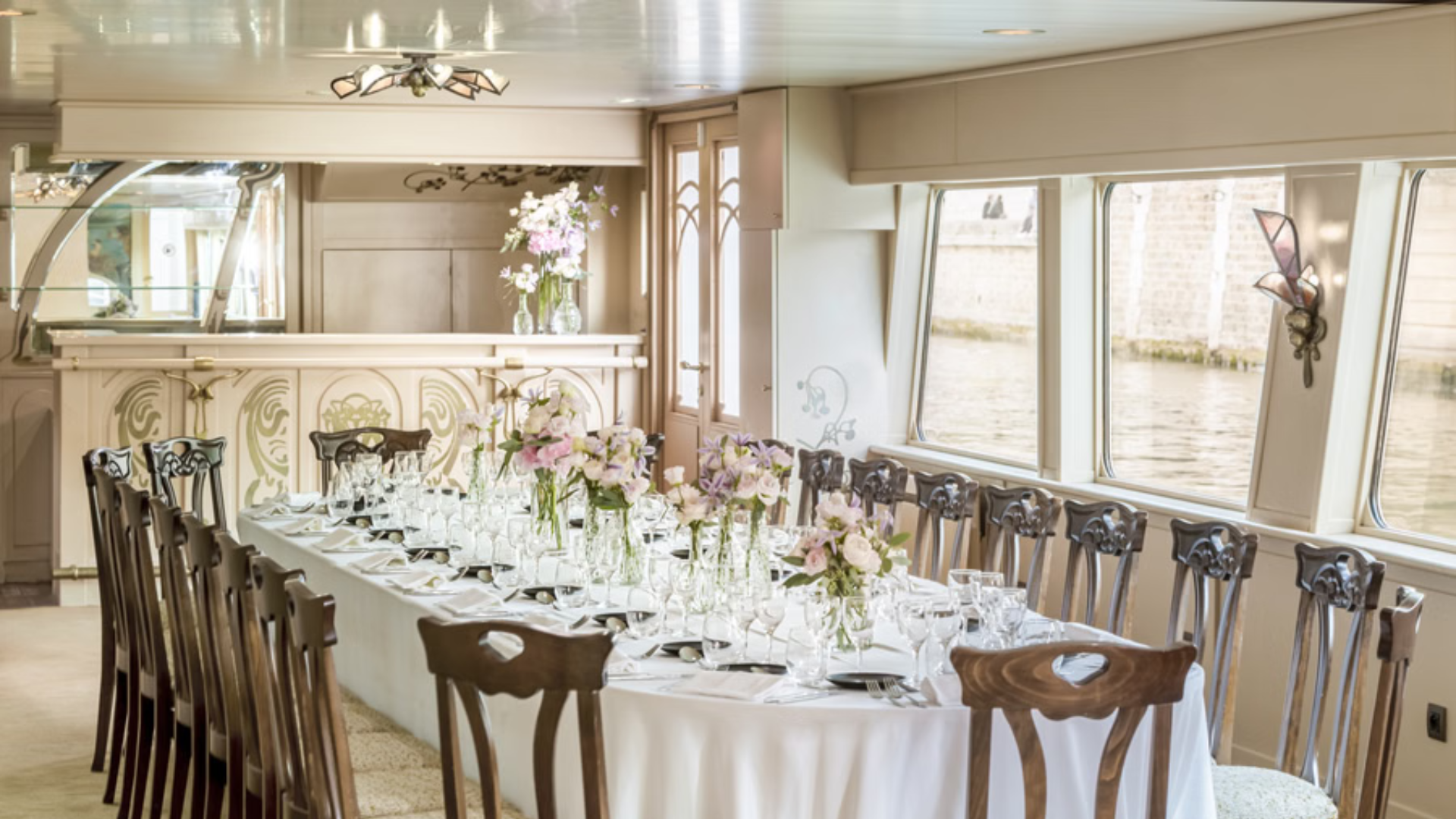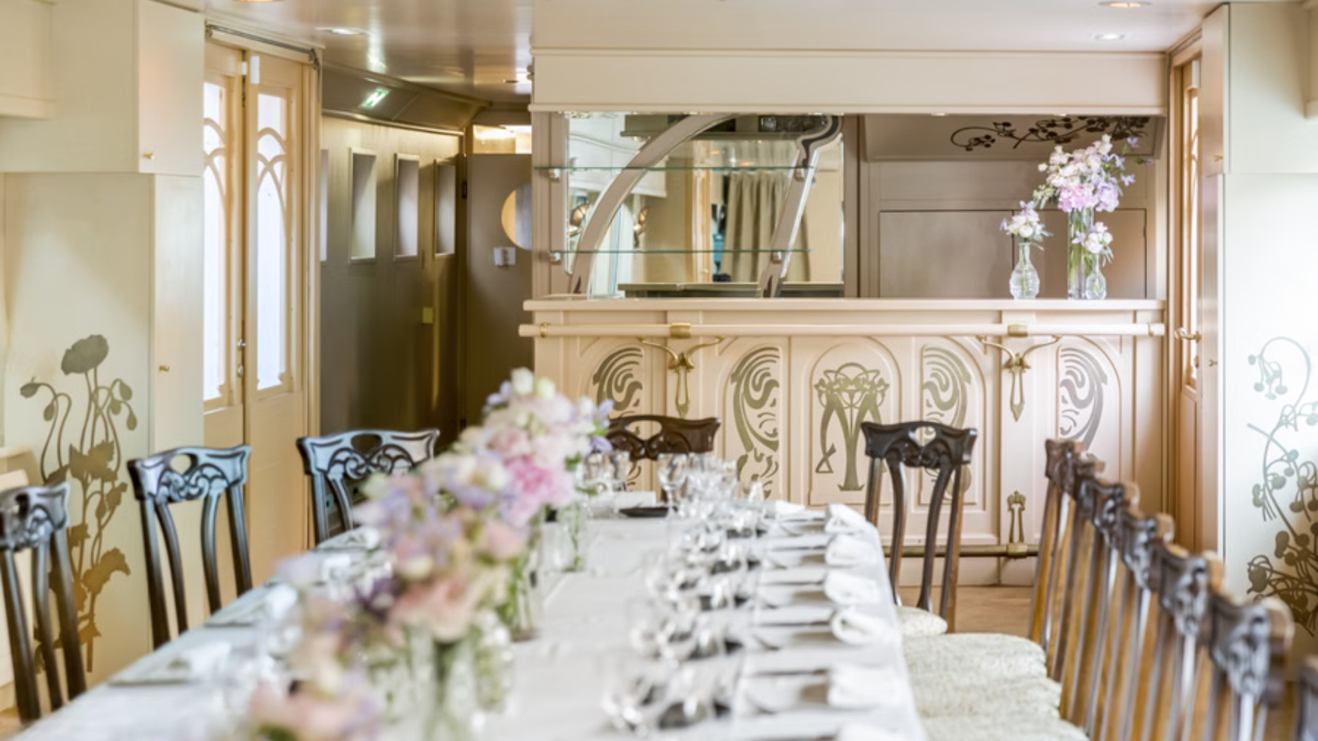 Espace intérieur : Le pont principal, décoré dans un style Belle Époque, immerge vos invités dans une atmosphère élégante et chaleureuse. L’alliance du design Art Nouveau et du confort moderne crée un environnement unique pour vos réceptions et dîners.