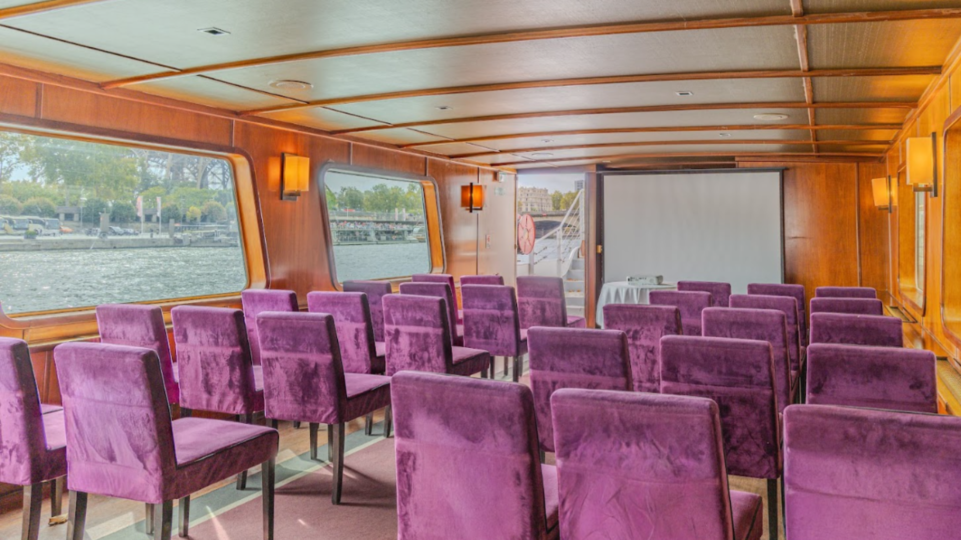 Espace intérieur : À l’intérieur, découvrez l’authenticité d’une péniche parisienne entièrement boisée. La salle de réception, habillée d’acajou, accueille vos convives dans une atmosphère chic, cosy et chaleureuse, idéale pour vos dîners et événements en toute intimité.