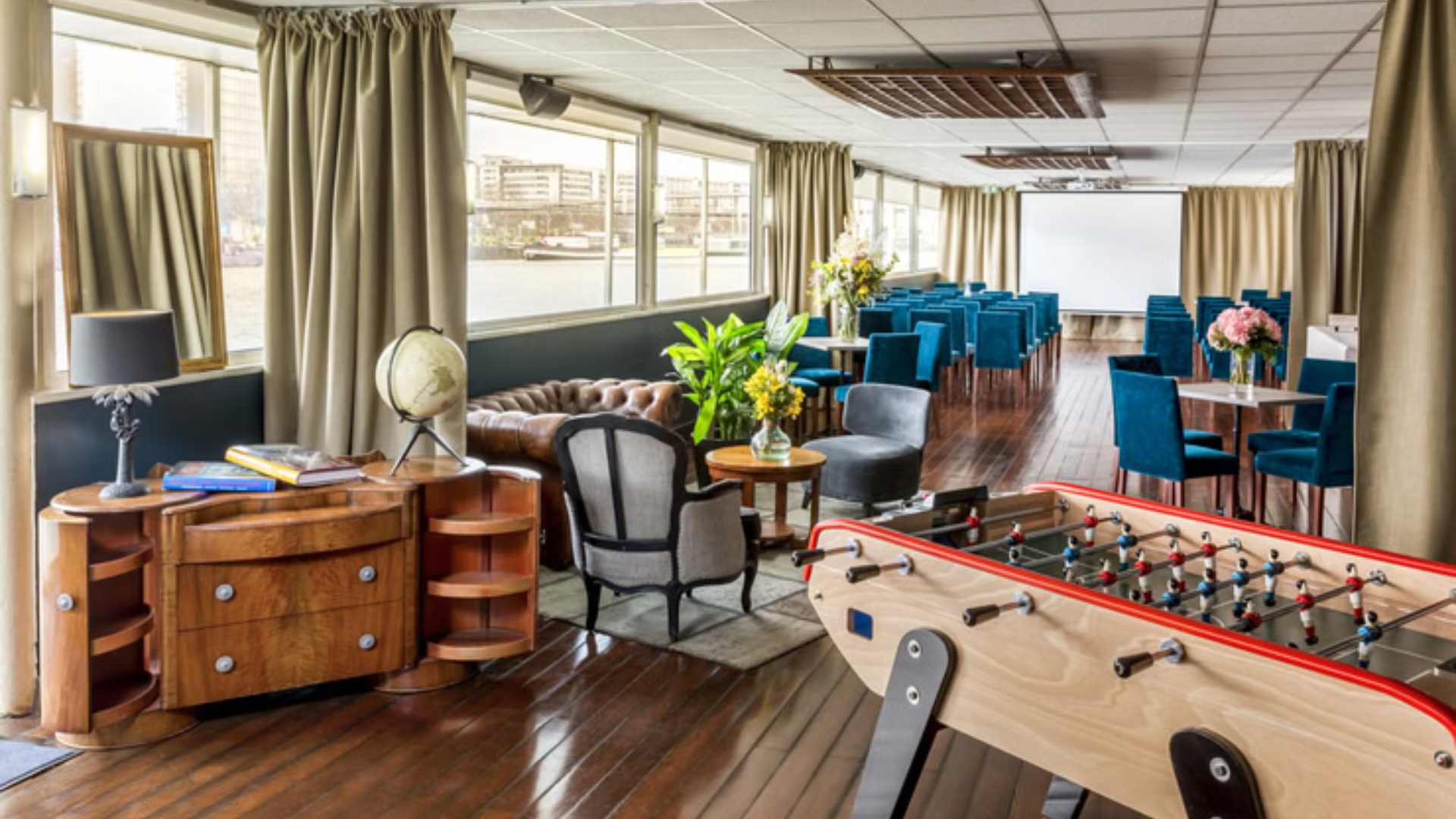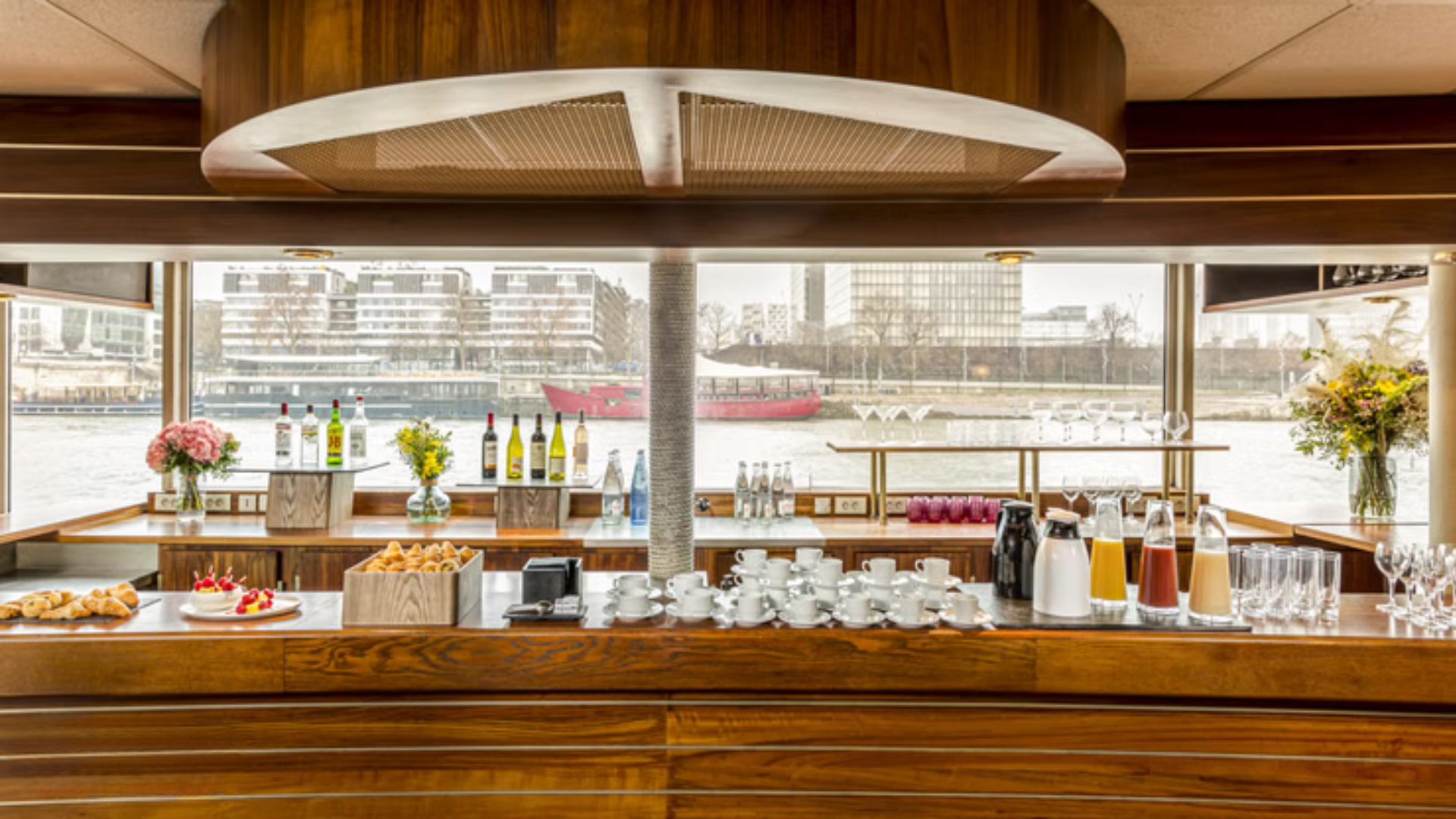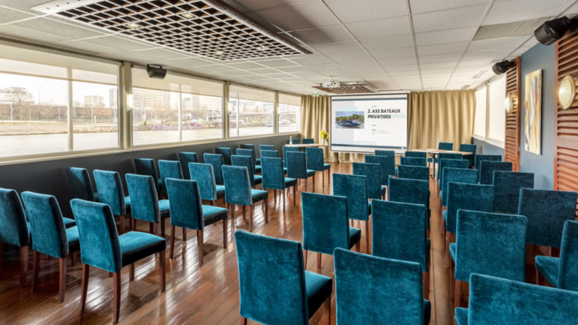 Espaces intérieurs : Avec 150 m² entièrement modulables, le Ponton Émile s’adapte à tous vos événements : séminaires, comités de direction, cocktails, dîners, afterworks, mariages ou anniversaires.
