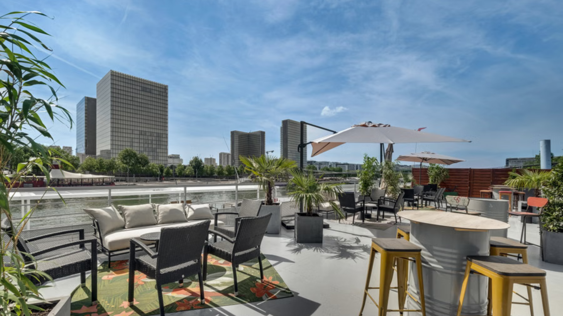 Le Ponton Émile, amarré au Port de Bercy, est une grande barge à quai offrant un espace unique sur la Seine. Son pont principal et sa terrasse de 100 m² à ciel ouvert permettent de profiter d’un moment paisible tout en admirant la vue sur la Bibliothèque François Mitterrand et le quartier d’affaires.
