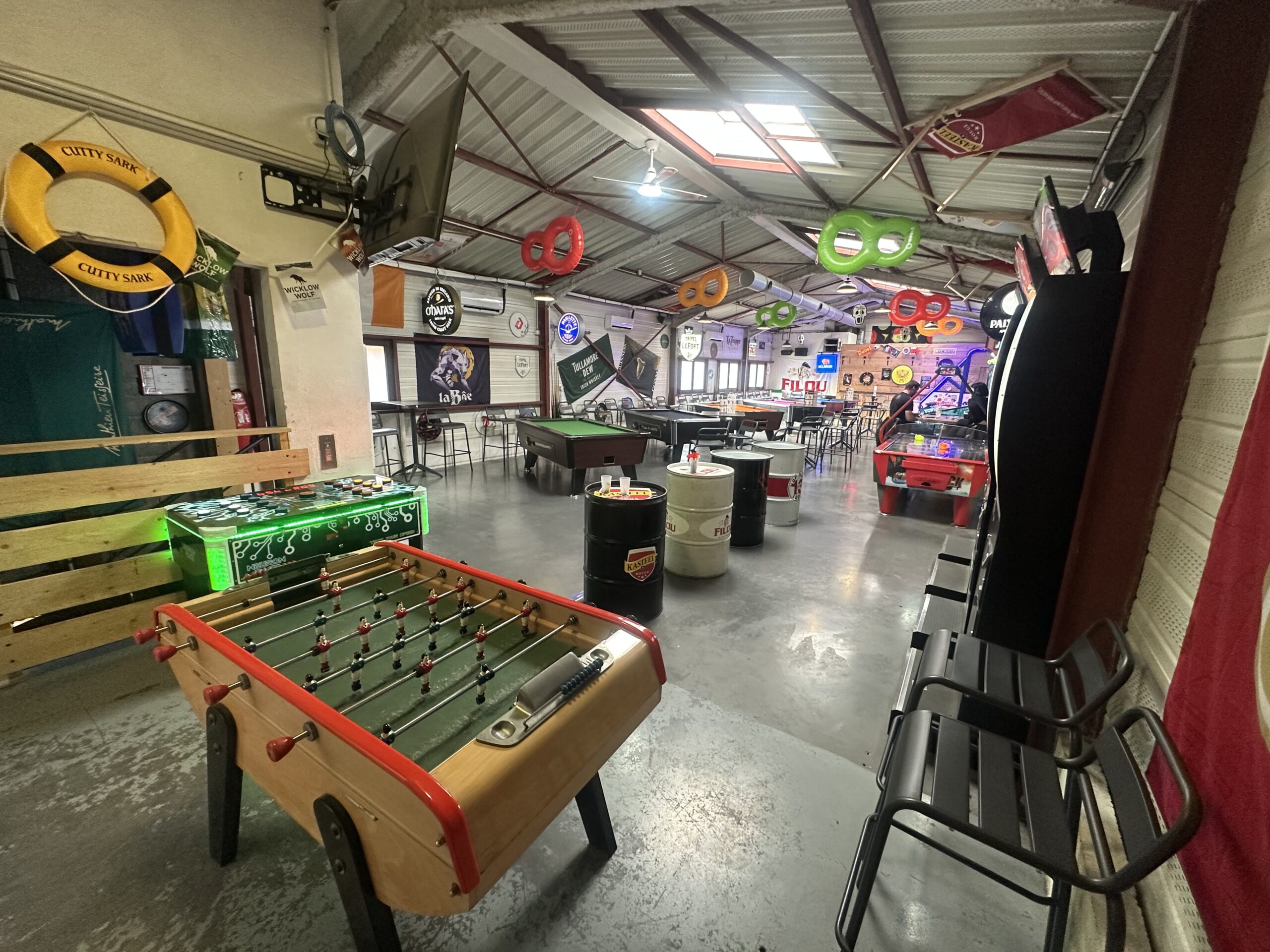 salle de jeux comprenant 5 billards, 4 machines à fléchette, 1 neuron (jeu de rapidité), air hockey, jeux de basket, flipper, jeu de tir, baby foot….)