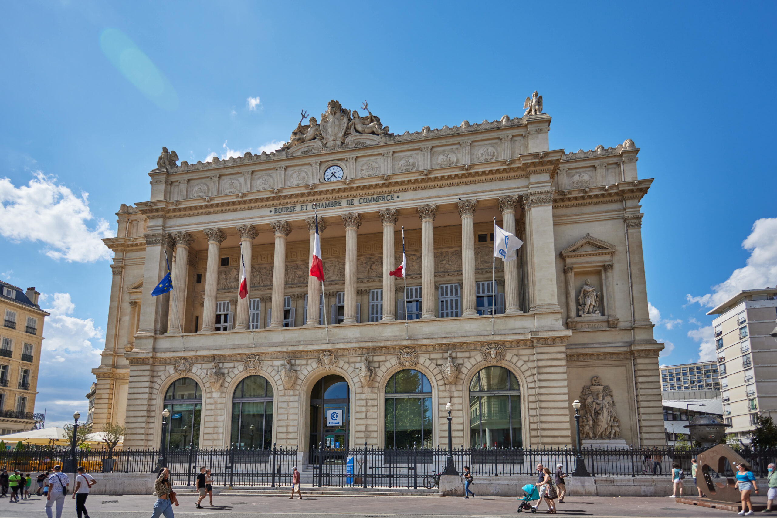 Inauguré en 1860 lors de la visite de Napoléon III et de l’Impératrice Eugénie, le Palais de la Bourse est un monument emblématique classé au titre des Monuments Historiques. Il abrite la plus ancienne Chambre de Commerce et d’Industrie au monde, et incarne l’histoire économique et maritime de Marseille.
