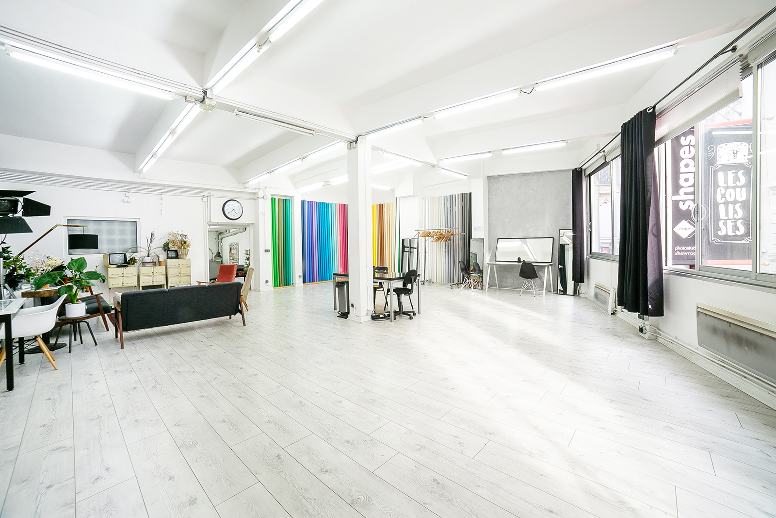 La lumière naturelle du studio photo est un atout majeur pour des shootings créatifs. Toutefois, si vous avez besoin de contrôler complètement l’éclairage, des équipements supplémentaires sont disponibles. Si vous avez besoin d’une configuration particulière, Studio Shapes vous accompagne dans l’aménagement du set.